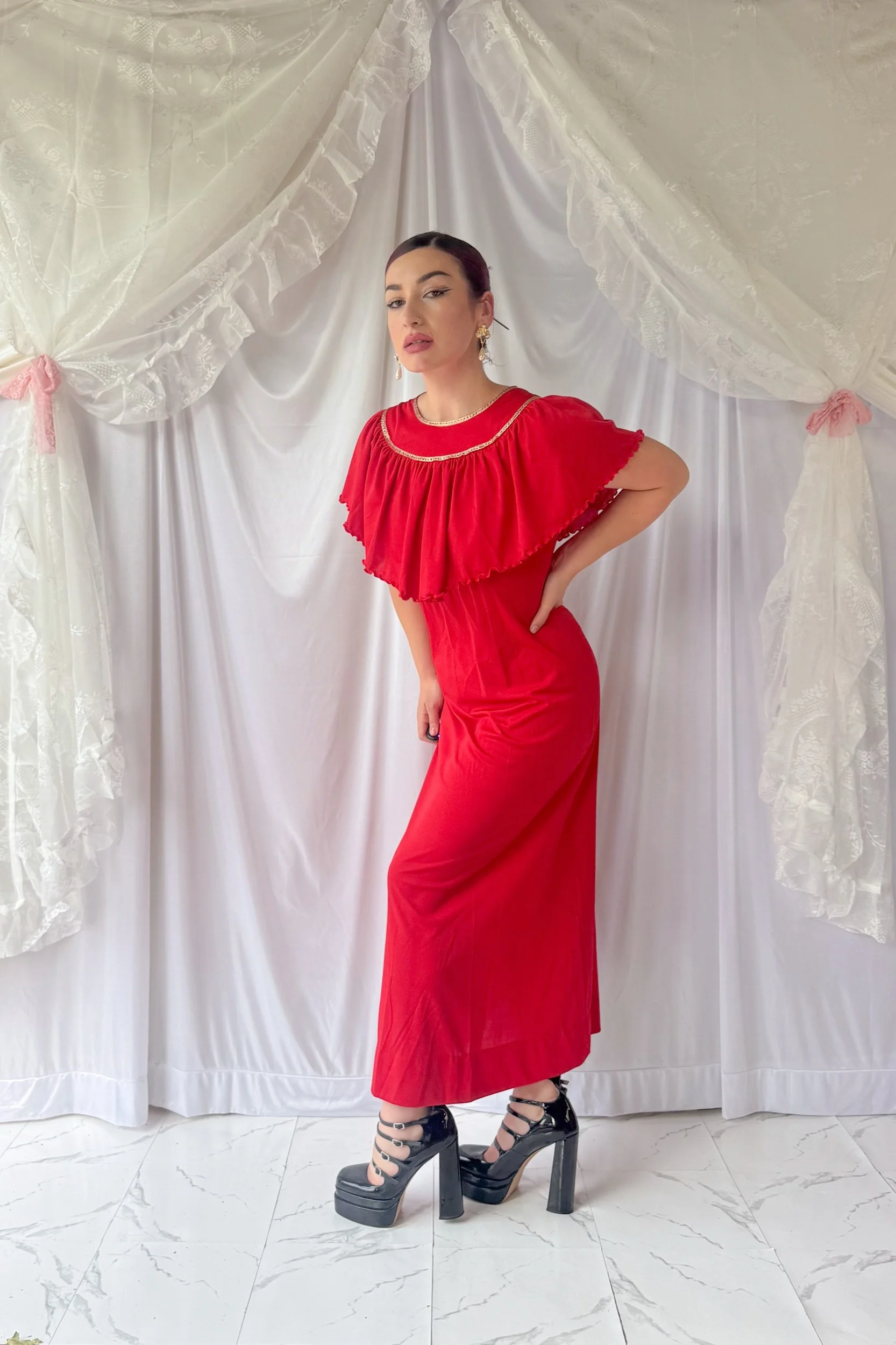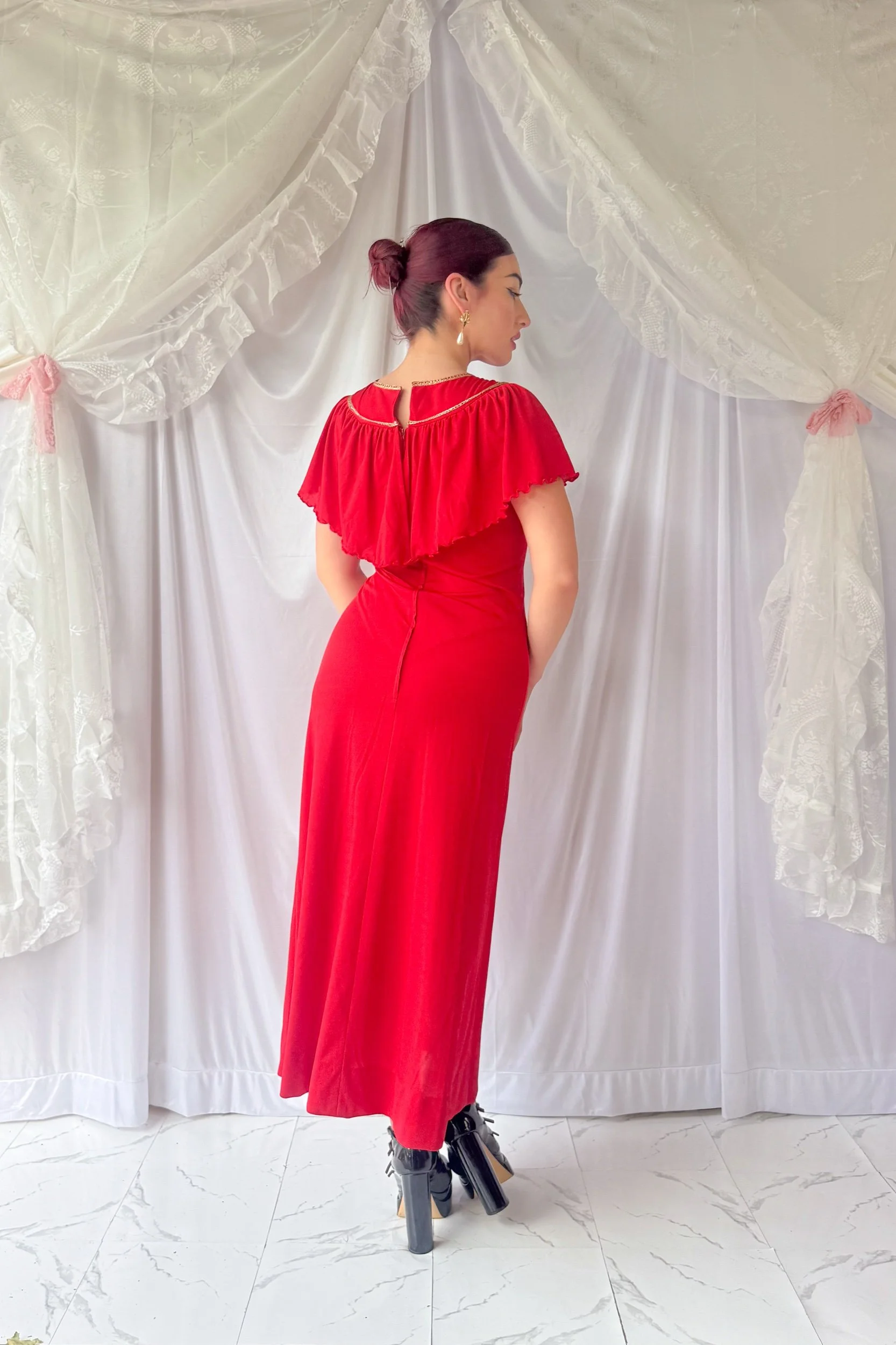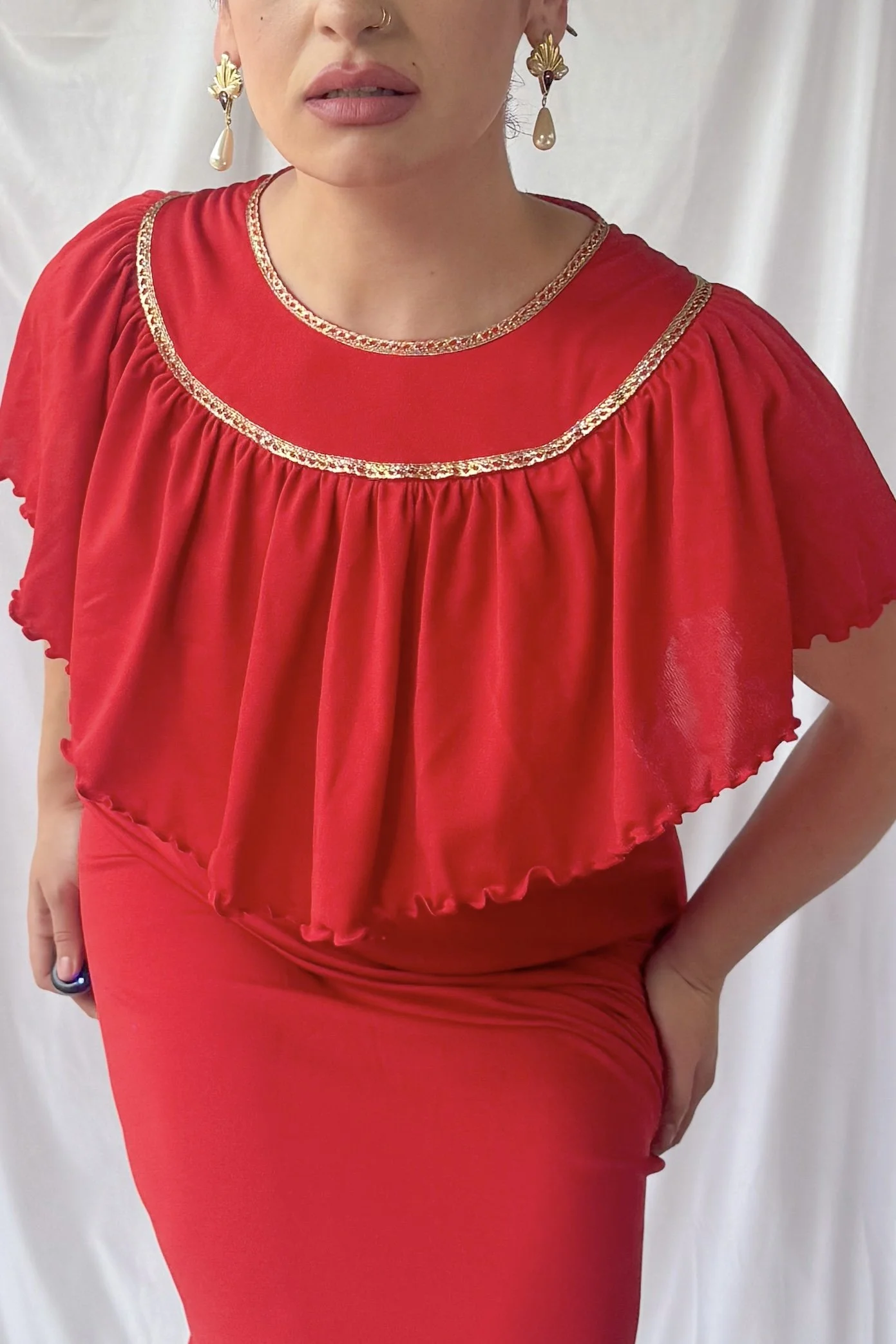 70s Cherry Red Gold Trim Gown