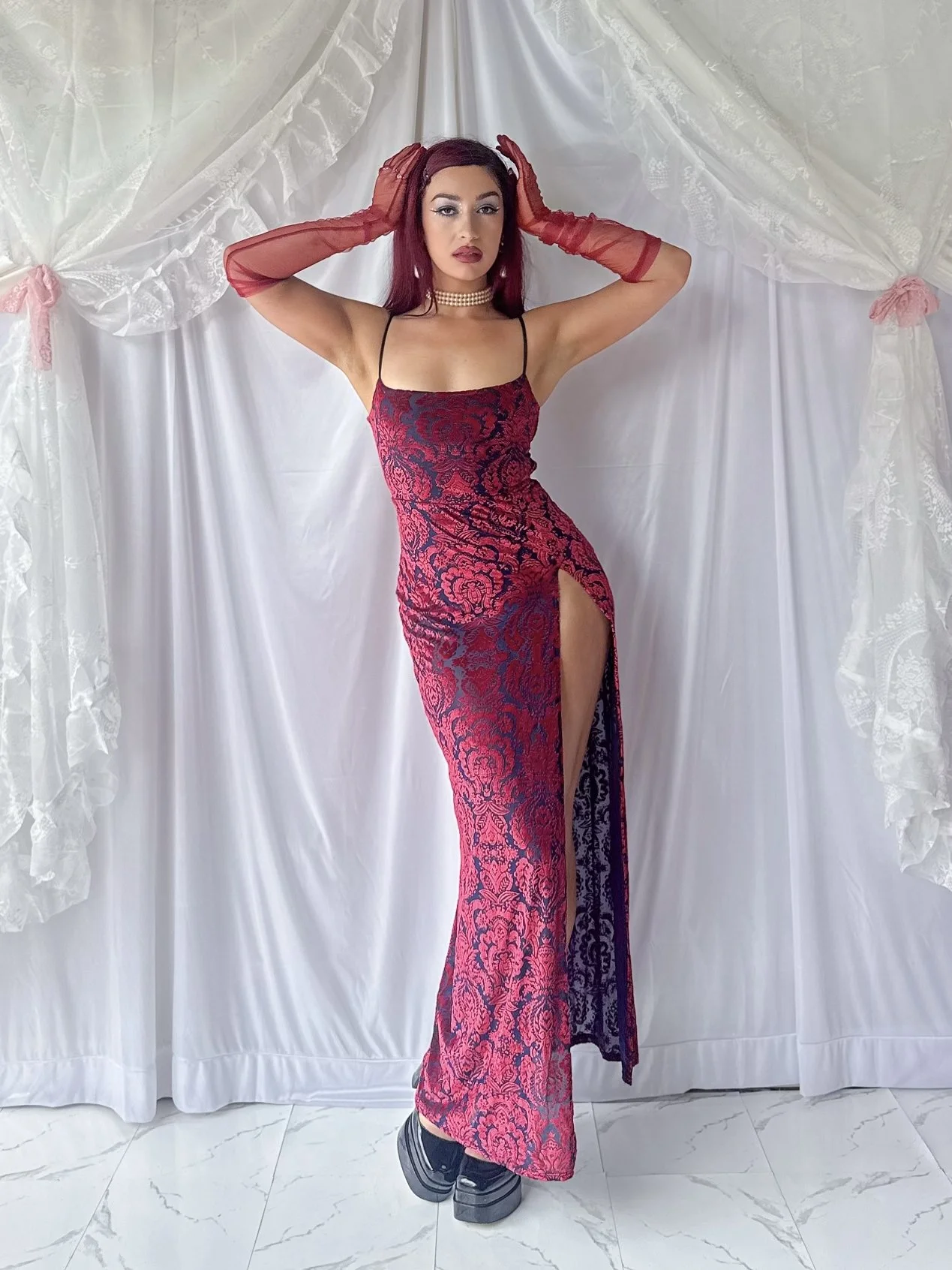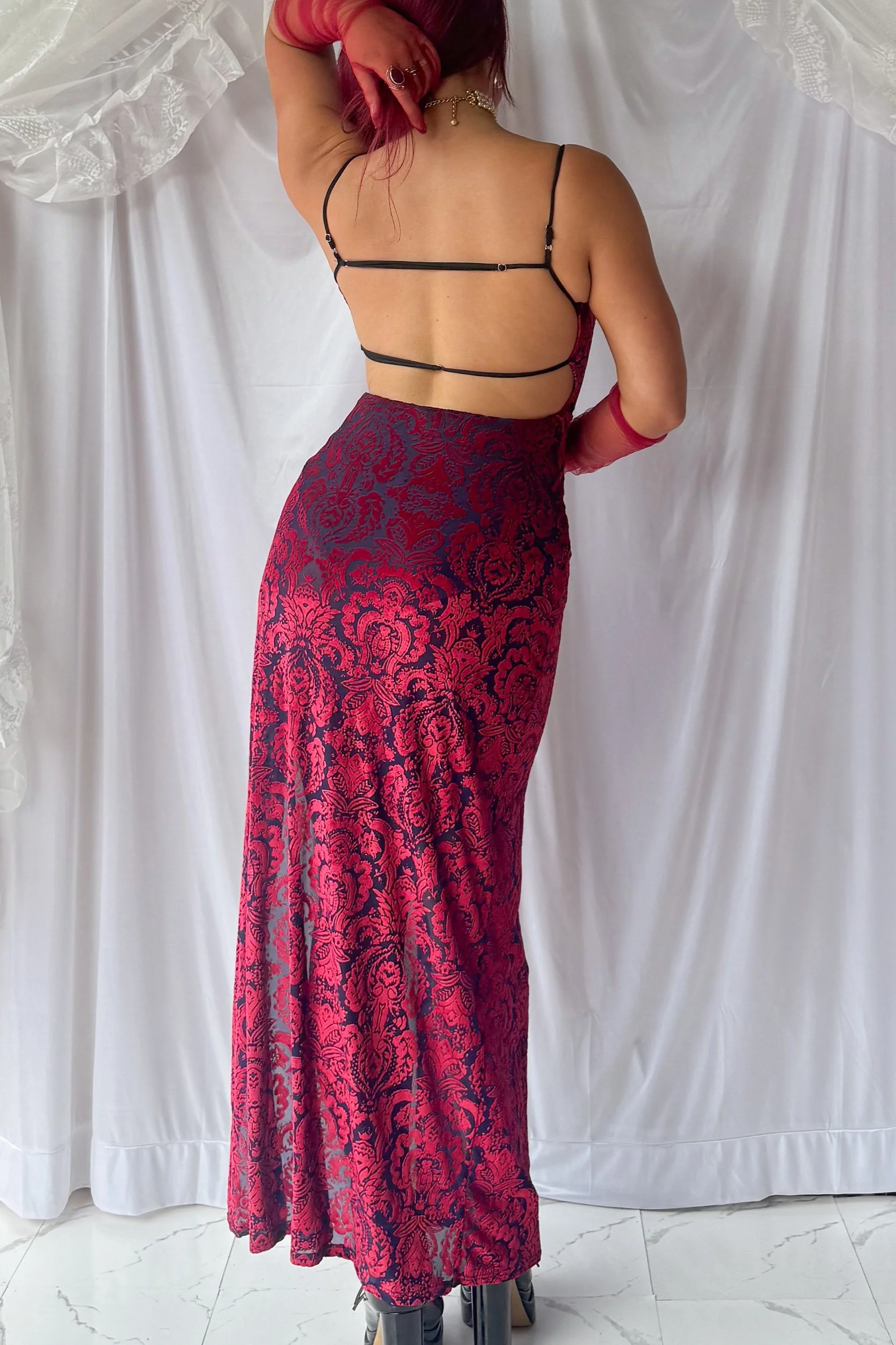 Velvet Paisley Open-Leg Evening Gown